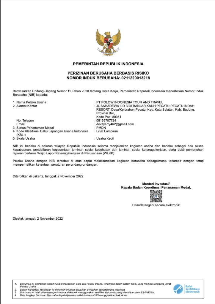 PT Polow Indonesia Tour and Travel is officially registered under Indonesia’s OSS (Online Single Submission) system with Business Identification Number (NIB): 0211220013218. The company holds active licenses in tourism and event-related services, including travel agency operations, MICE, and Umrah & Hajj travel.